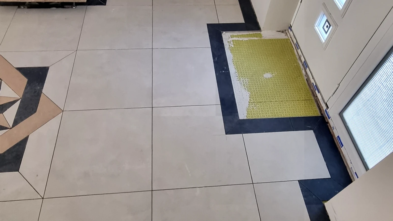This project involved the professional installation of floor tiles in a hallway, finished with a striking decorative pattern as a central feature.