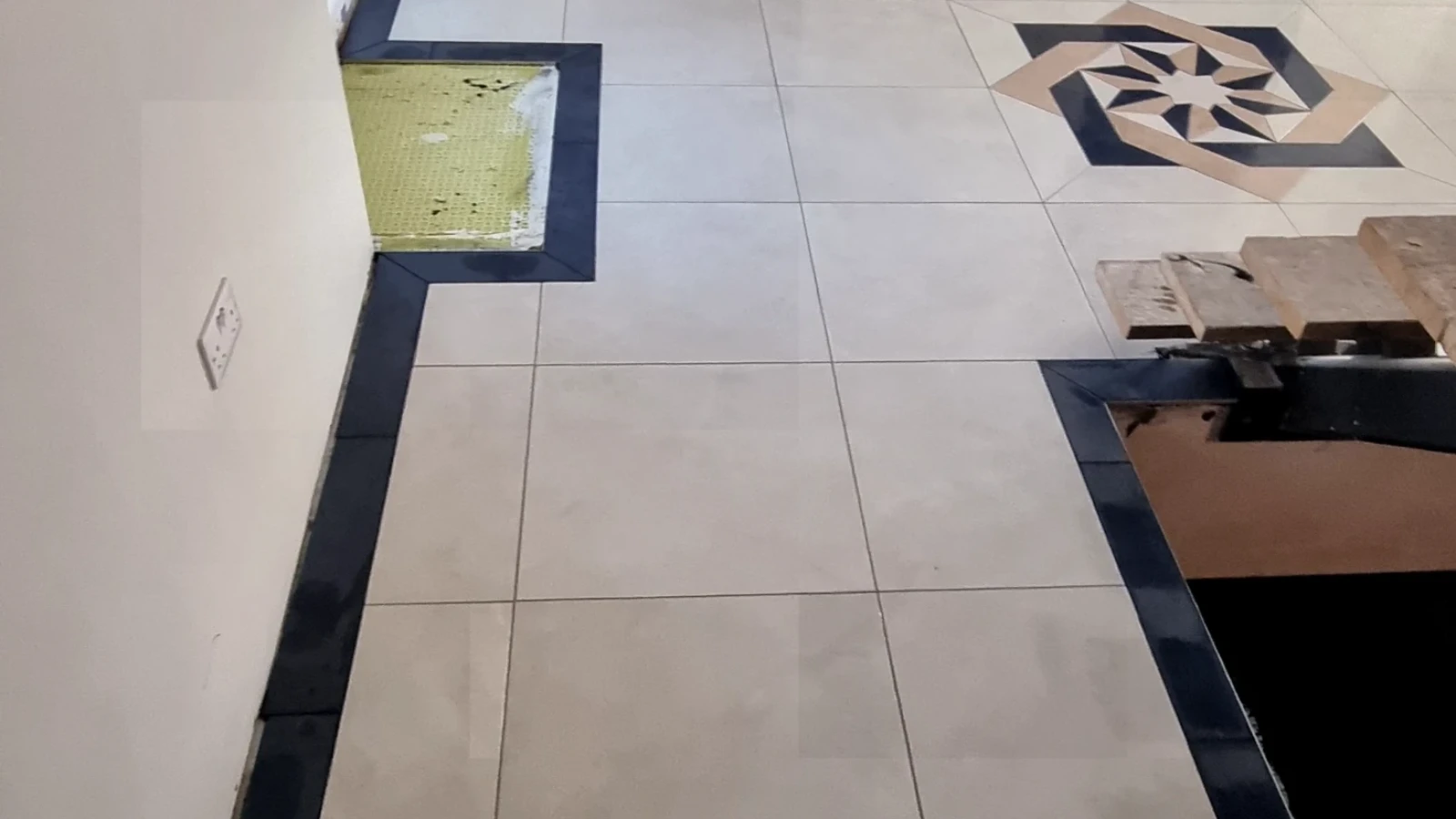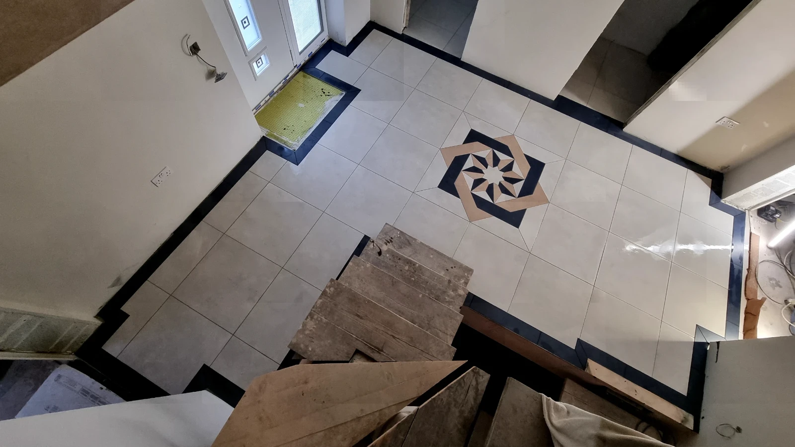 This project involved the professional installation of floor tiles in a hallway, finished with a striking decorative pattern as a central feature. Each tile was carefully aligned to ensure clean lines, perfect symmetry, and a durable, long-lasting finish. The contrasting border and patterned centre add character and elegance, transforming the hallway into a welcoming and visually impressive space. All work was completed to a high standard, with attention to detail and quality craftsmanship throughout.